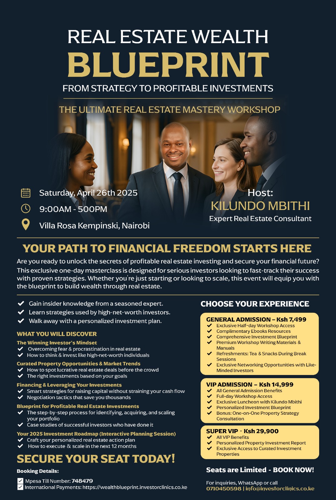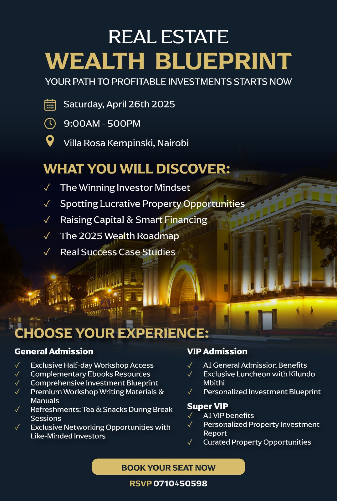 With over 5,000+ trained investors and billions transacted under his guidance, Kilundo brings you a one-day masterclass that may change your wealth path forever.